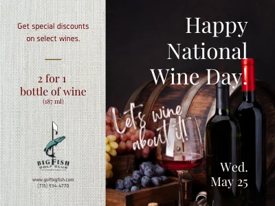 National Wine Day • 5.25 National Wine Day Wednesday, May 25 Great Savings on select bottles of wine. ONE DAY ONLY + Add to Google Calendar + iCal / Outlook export The event is finished. Date May 25 2022 Expired! Time All Day Category Special Offer Share this event